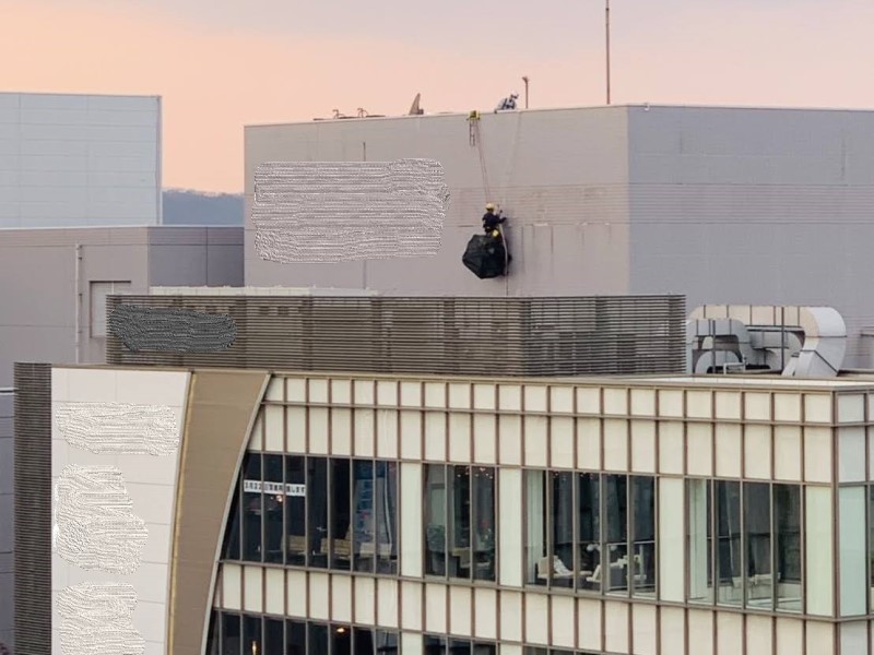 まずは横胴縁を利用して縦エイドクライミングで上昇し、H鋼より墜落防止用の親綱、および垂直ロープを設置。設置した親綱で墜落防止を取り、横胴縁にてワークポジショニングを取ることで横移動を行い配線を敷設して行きます。器具の設置壁面にはちょうどいいCチャンがあったのですが、柱を超えての横移動が必要なため、柱を挟んだ両側にスリング+ロープを2ずつセット。これで任意の箇所で横移動+垂直移動が可能となります。柱を超える際にはロープtoロープで乗り越え、配線及び器具取付はスリングとロープを使用して水平垂直移動を行いながら進めていきます。常に2点支持となるようにポイントを確保して安全作業で無事器具の取付が出来ました。