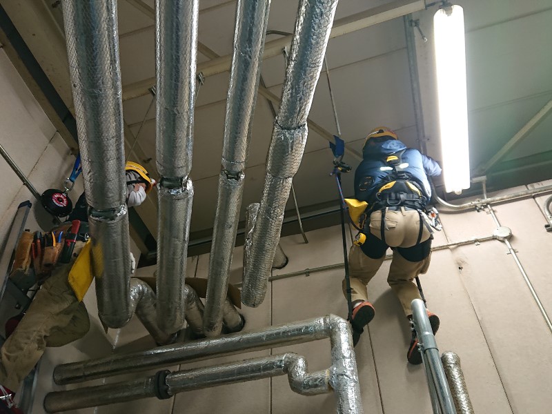 現場内は沢山の配管が設置されているため足場や高所作業車が使用できませんでした。こんな時に役に立つのが弊社お馴染みの高所ロープ作業。この現場はそれほど高くはありませんが、ロープ作業は高さに関係なく足場や脚立作業が困難な場所で大変便利な工法です。