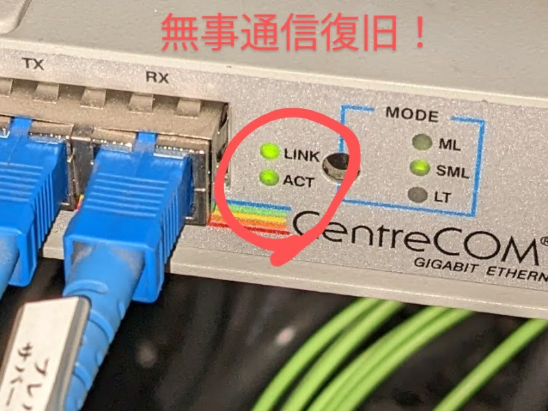 初めてのお客様ですし現場の様子が全くイメージできません。弊社から車で10分程度の近場だったので準備をしてまずは調査にお伺いしました。調べてみると光の疎通が全く確認できない状態です。弊社に相談されるまでの間にも恐らく色々試案されたのでしょう、機械設備のメーカーさんとも既に対応策について協議されておりました。切断場所もすぐには特定できないだろうとのご判断で、機械設備業者さんと相談の結果、取急ぎはLANケーブルにて仮復旧をされるとの事。まずは仮復旧の目途が立ったのでひと安心。その日はそれで引き上げました。